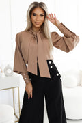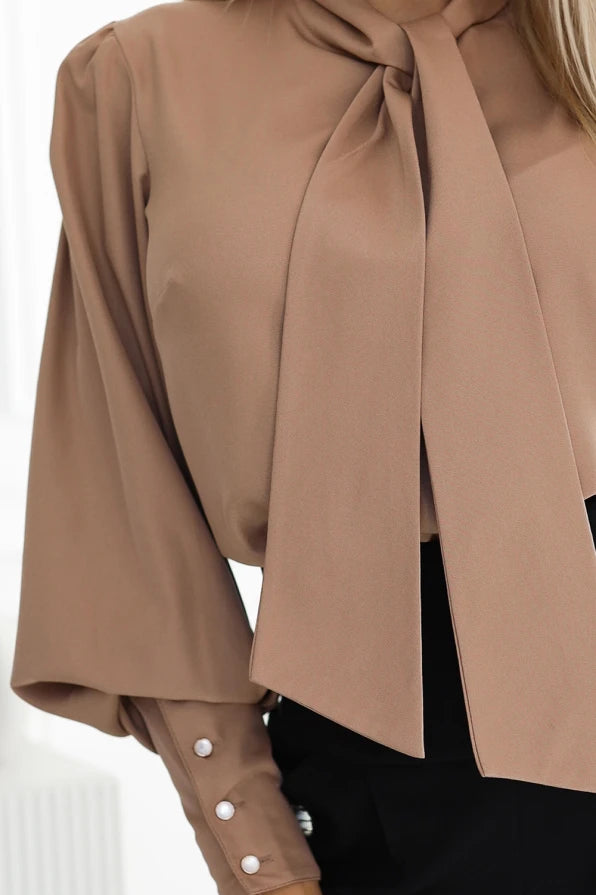 Elegantiška smėlio spalvos palaidinė su kaspinu prie kaklo, kuri puikiai tiks tiek verslo susitikimams, tiek kasdieniam elegantiškai stiliui. Švelnus audinys ir rafinuotas kirpimas suteikia moteriškumo ir profesionalumo, o patogus siluetas užtikrina komfortą visą dieną.