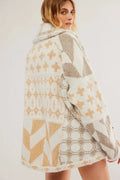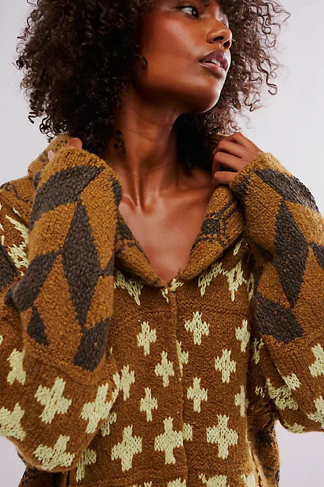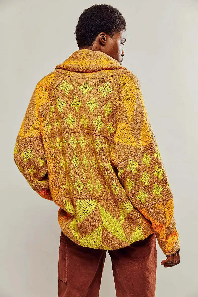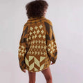 Šis moteriškas megztinis kardiganas išsiskiria ryškiu Y2K stiliaus raštu ir laisvu siluetu, kuris suteikia modernų bei patogų įvaizdį. Ilgos rankovės, platūs raštai ir atverčiama apykaklė puikiai dera tiek prie džinsų, tiek prie kasdienės aprangos. Pagamintas iš minkšto megzto audinio, todėl idealiai tinka rudens ir žiemos sezonui.